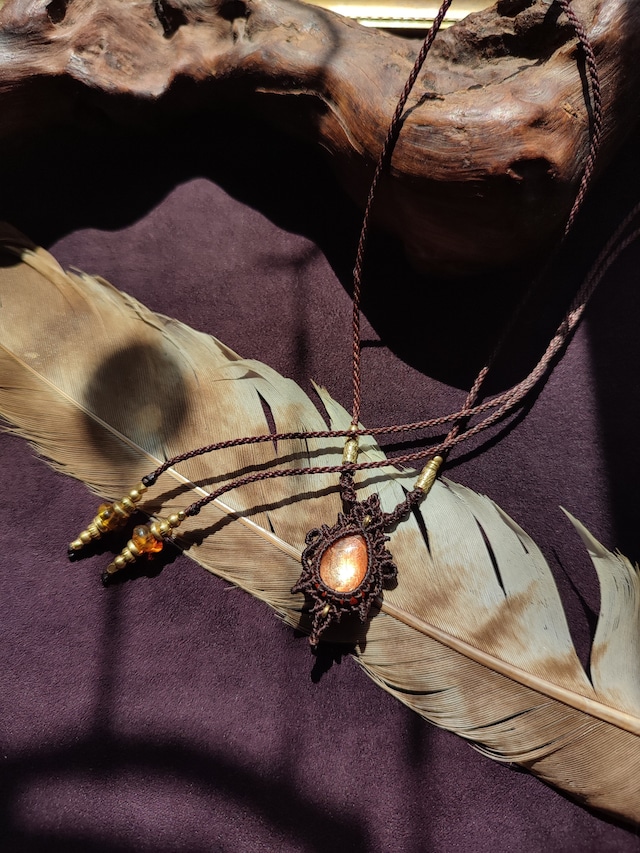 サンストーンを使ったペンダントのシリーズ 神秘のご紹介です 太陽を象徴するサンストーンはムーンストーンと同様にとても人気のある石です このドロップ型のピースはギラっと強い光を持っており、とても強い存在感を感じます 星の神秘、天体の神秘、私たち人間にはまだまだ未解明の神秘がこの星にも宇宙にも散りばめられています。そんな僕なりの神秘を形にした作品となります タイトルに神秘と名付けさせていただきました 神秘のシリーズでは、地球のエレメントを感じられる編み込みを意識しています 水や土、火や風を表す編み込みを絵画の様な地球の神秘である鉱物にはめる額縁のように お祈りを込めた作品となります 使用したワックスコードの色はダークブラウンです 石のサイズは(縦x横x高) 17x14x7mm 全体のサイズは (縦x横x高) 40x22x7mm 使用したビーズはアンバーででエンド部分はシンメトリーデザインを採用し、様々な着こなしにも合わせられるシンプルな形に仕上げました ネックレス紐はココナッツのアジャスター付で最長で約92cmでま可能となります この地球のかけらと皆様が共に末永く光り輝き続けますように :::::::::::::::::::::::::::::::::::::::::::::::::::::::::::::::::::::::::::::::::::::::::::::::::::::::::::::::::::::::::::::::::::::::::::::::::::: *近年目に余るほどのデザイン等の盗作や模造品があることにとても心を痛めております 私としては著作権などもありませんが、お迎えくださる持ち主様にこの世でたった一つのも のをご提案したいと考え、とても時間を注いで制作しております 同業者の方にはどうか今一度自身の物造りへのあり方を振り返っていただけたらと思います それぞれがそれぞれの色で表現をできたら多種多様なアートが見られる世界になるのかと思います* 天然石を素材にしているため、中には石特有の内包物(インクルージョン)や、自然の欠け(クラック)等が見うけられるものもございます。 クラック、インクルージョン等に関しては、本物の天然石ならではの個性としてご理解・ご了承願います。 ※ご使用のパソコンモニター・ディスプレイの環境設定により商品の色味や質感などの見え方が異なる場合がございます。 商品のイメージを忠実に再現する努力をしておりますが、実物と多少の違いがあることご了承願います。