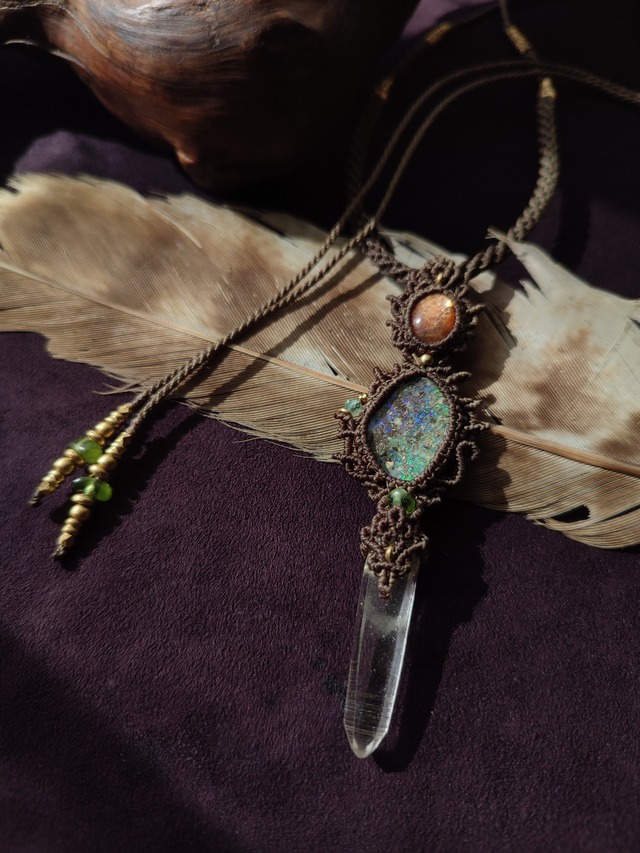 エチオピアンオパール×ヒマラヤ水晶ポイントの二種を使った Force のご紹介です 鮮やかなグリーン遊色の光を持つエチオピアンオパール 見る角度で強く輝く姿を見せてくれる緑の光のバランスも良く上品で高品質なピースです クリスタルの作品にはよく使うオパールも様々ですがこちらはエチオピア産オパールです 微細に感じる非対称なクリスタルを編み込みでバランスを取りクリスタル独特のフォルムや透明感が自然と感じられるデザインを意識いたしました 下部には透き通る透明感のある清らかなヒマラヤの雪解け水の成分から生成されたクリスタルを使っています 特有のフォルムもさることながら透き通るような透明度の中にもワイルドな傷にみえる部分がありますが、マクロレンズで覗き込むと欠けではなくセルフヒールド(自分で傷を癒そうとしている部分が見られるとても芸術的なインドヒマラヤ パルバティバレー産の水晶(自主採)です 天面のオパールが乗っている部分は角度のついた形状となっており、装着時に天の光が受けやすいこともありとても綺麗に輝く構造となっております 大自然が作り出す造形美と無加工の自然美が包まれたポイントとなります 水の精霊 水晶はものすごい歳月をかけて形を成していると聞きました この透明度はいったいどれほどの年月をかけて出来上がったのか想像するだけでも年上の生き物である水晶を大切に丁寧に仕上げることだけに集中して仕上げさせていただきました Forceと称して作品のタイトルを付けました ゆるぎない力が肉体を超え内なる宇宙より湧き上がるイメージから 持ち主様の人生という旅のお供になります様にと名付けさせて頂きました 私の作品はすべての石や素材を自身の目で見極めて現地まで買い付けに行っております 一つ一つのサイズ感やバランスに重きを置き この地球という芸術をマクラメを通して表現できたらと制作しております 使用したワックスコードの色はカーキです 石のサイズは下から(縦x横x高) 53x12x10mm 14x9x5mm ペンダント全体のサイズは(縦x横x高)64x16x17mm 使用したビーズはヘマタイトとペリドットでエンド部分はシンメトリーデザインを採用し、様々な着こなしにも合わせられるクールでシンプルな形に仕上げました ネックレス紐はココナッツのアジャスター付で最長で約90cmでま可能となります この世に二つと存在することの出来ない鉱物の輝きを皆様にお届けできたら幸いです この地球のかけらが皆様と共に末永く光り輝き続けますように :::::::::::::::::::::::::::::::::::::::::::::::::::::::::::::::::::::::::::::::::::::::::::::::::::::::::::::::::::::::::::::::::::::::::::::::::::: *近年目に余るほどのデザイン等の盗作や模造品があることにとても心を痛めております 私としては著作権などもありませんが、お迎えくださる持ち主様にこの世でたった一つのも のをご提案したいと考え、とても時間を注いで制作しております 同業者の方にはどうか今一度自身の物造りへのあり方を振り返っていただけたらと思います それぞれがそれぞれの色で表現をできたら多種多様なアートが見られる世界になるのかと思います* 天然石を素材にしているため、中には石特有の内包物(インクルージョン)や、自然の欠け(クラック)等が見うけられるものもございます。 クラック、インクルージョン等に関しては、本物の天然石ならではの個性としてご理解・ご了承願います。 ※ご使用のパソコンモニター・ディスプレイの環境設定により商品の色味や質感などの見え方が異なる場合がございます。 商品のイメージを忠実に再現する努力をしておりますが、実物と多少の違いがあることご了承願います。