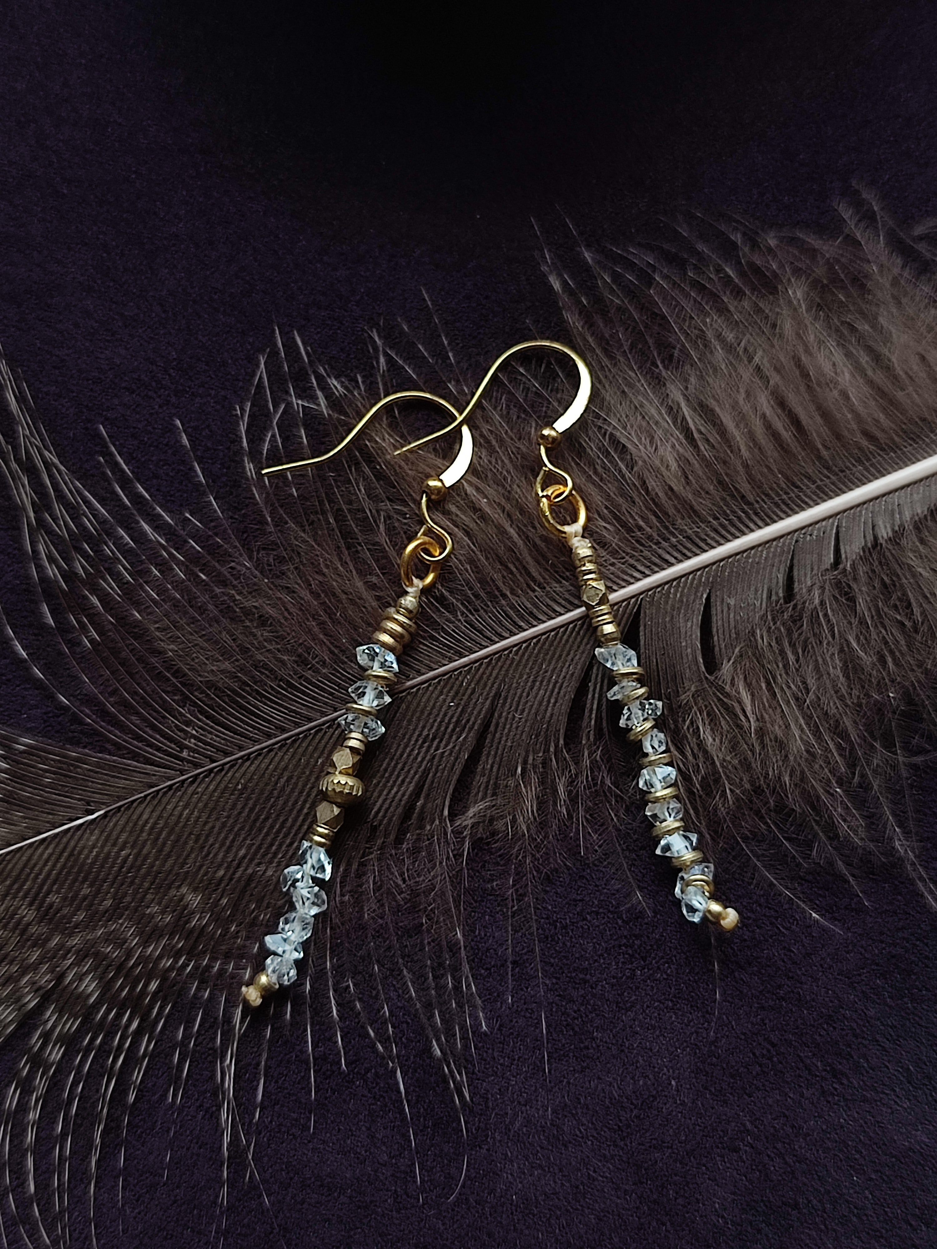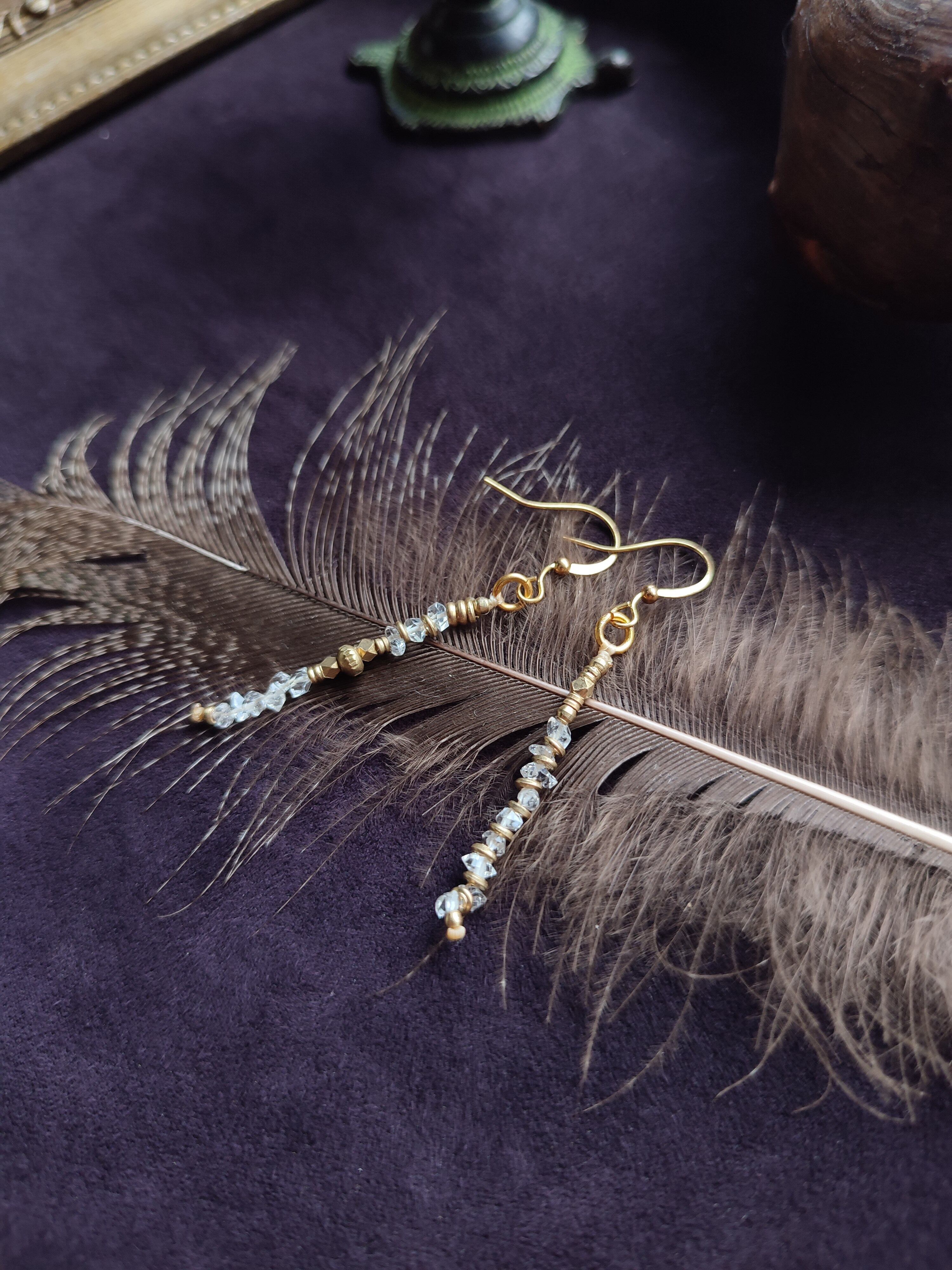 存在感のある両剣のハーキマーダイヤモンドを3、6粒、もう片方には9粒でシンプルにピアスのお仕立てすることで素材そのものの迫力や姿がより引き立ってます✽