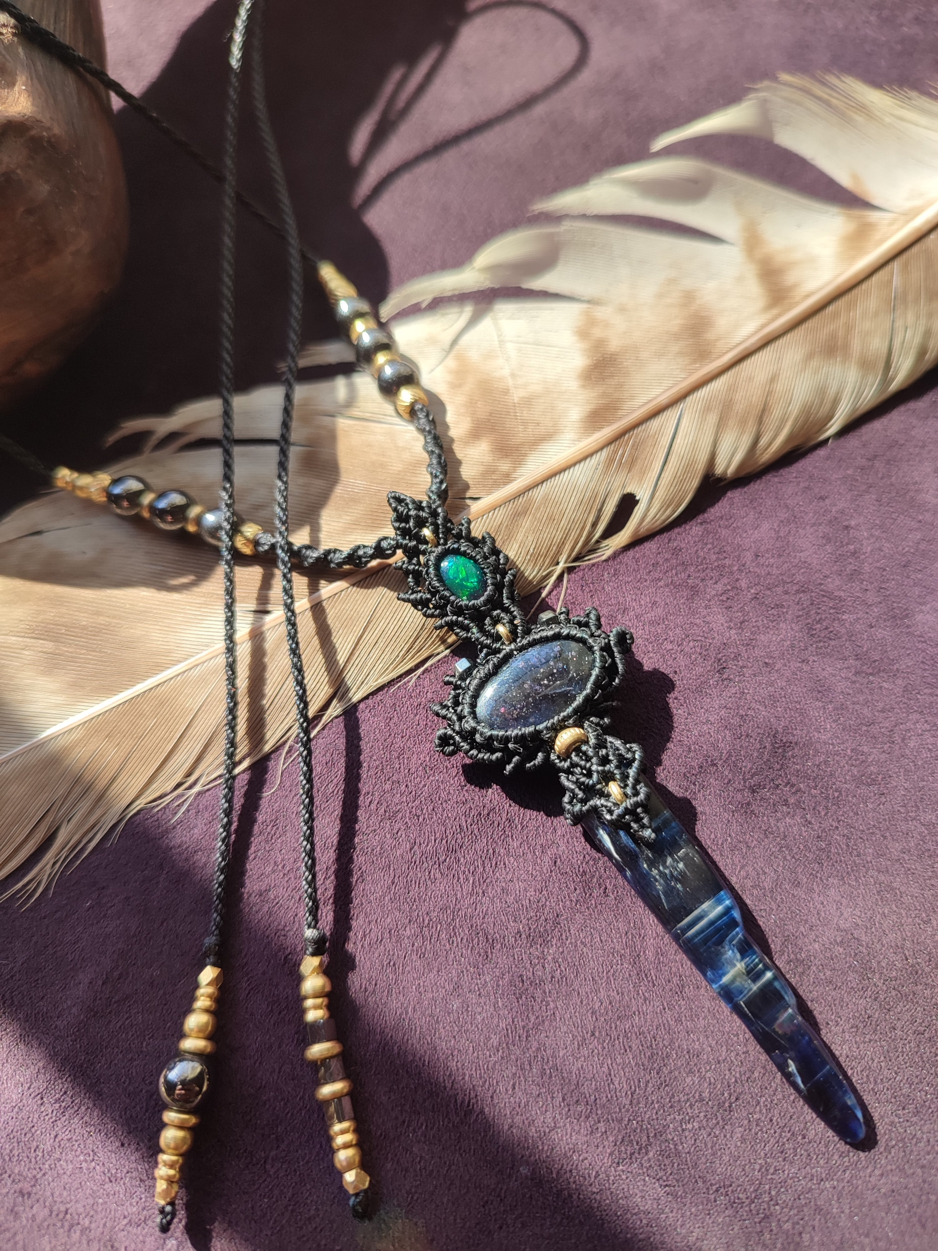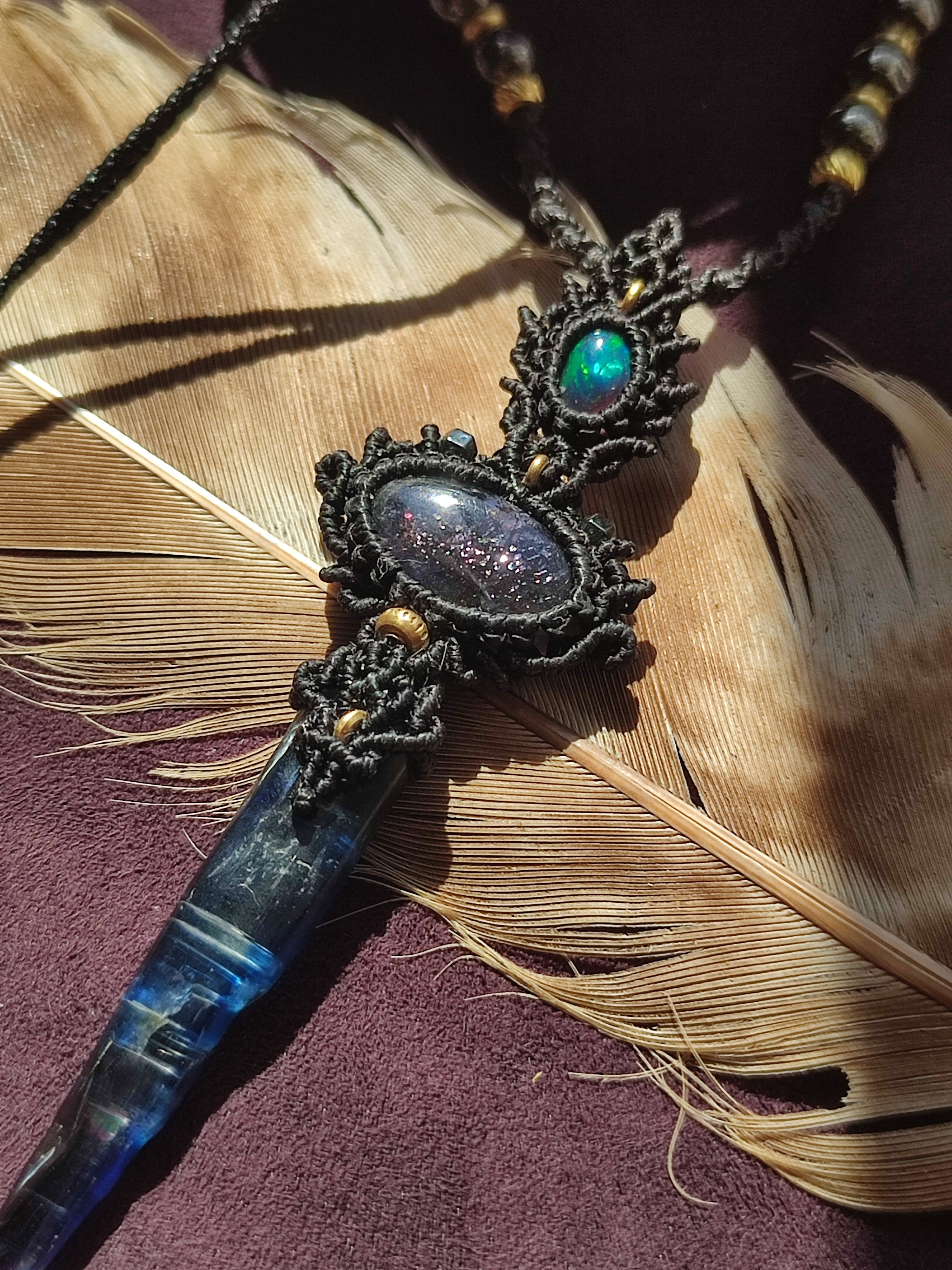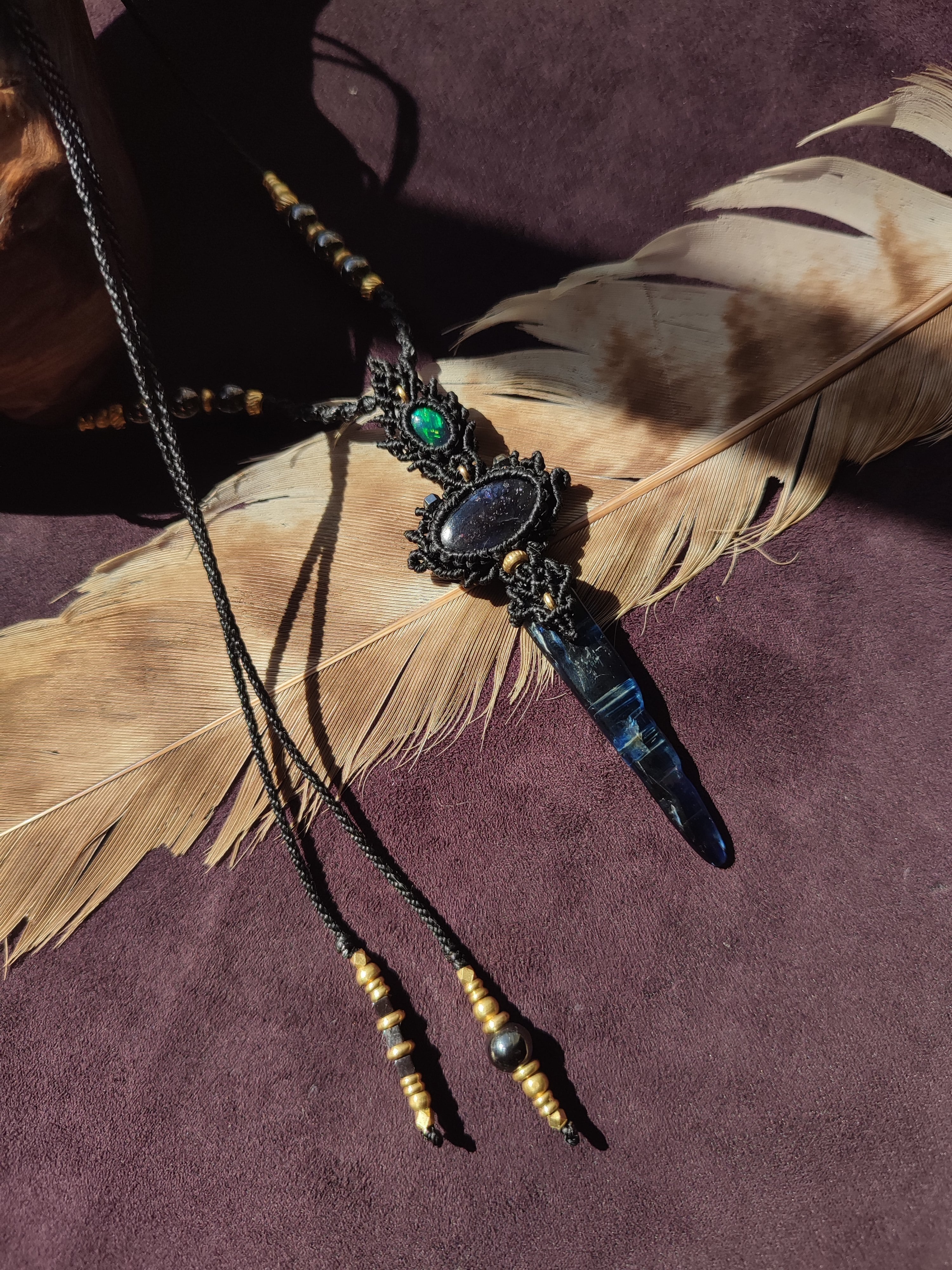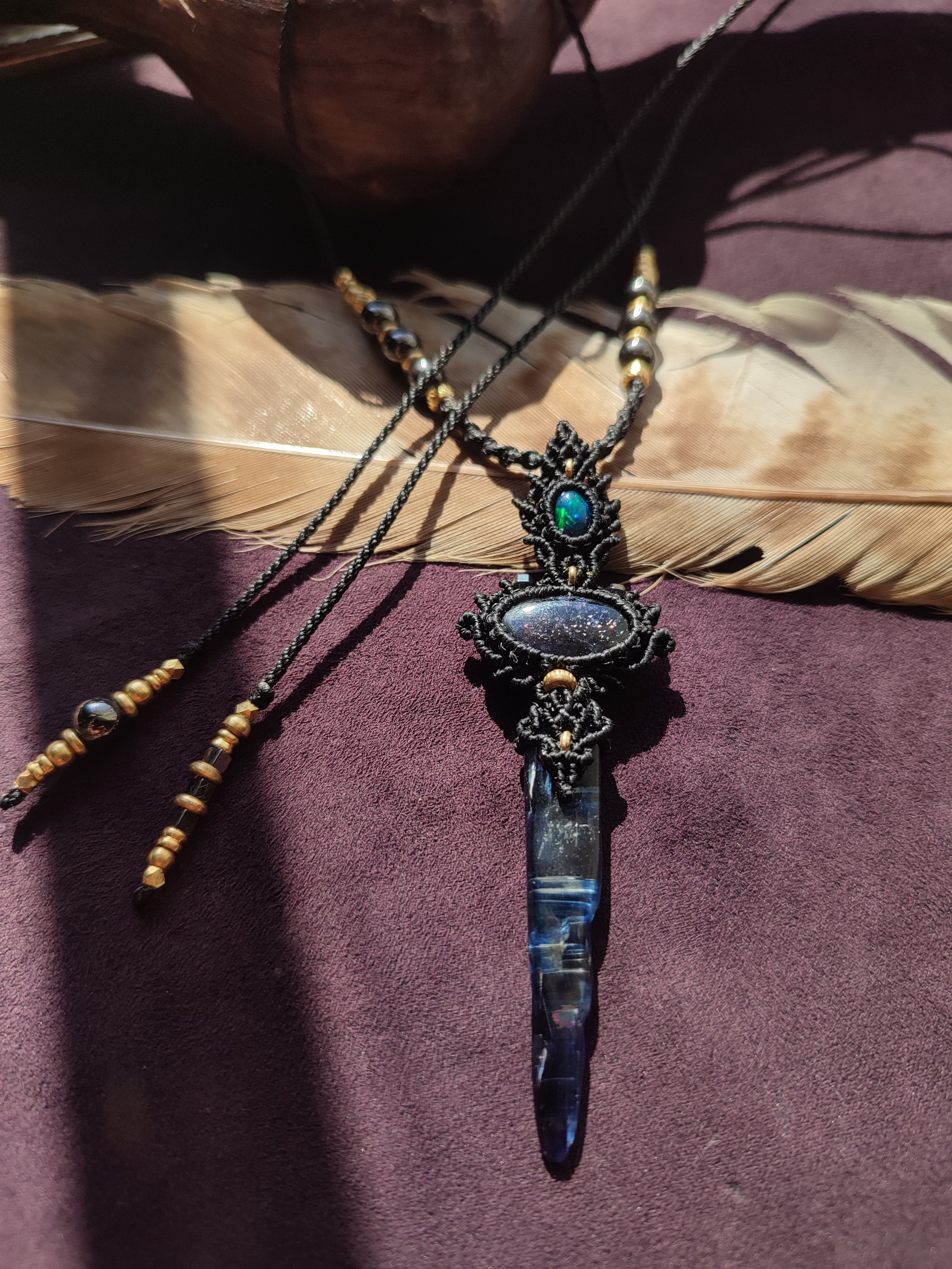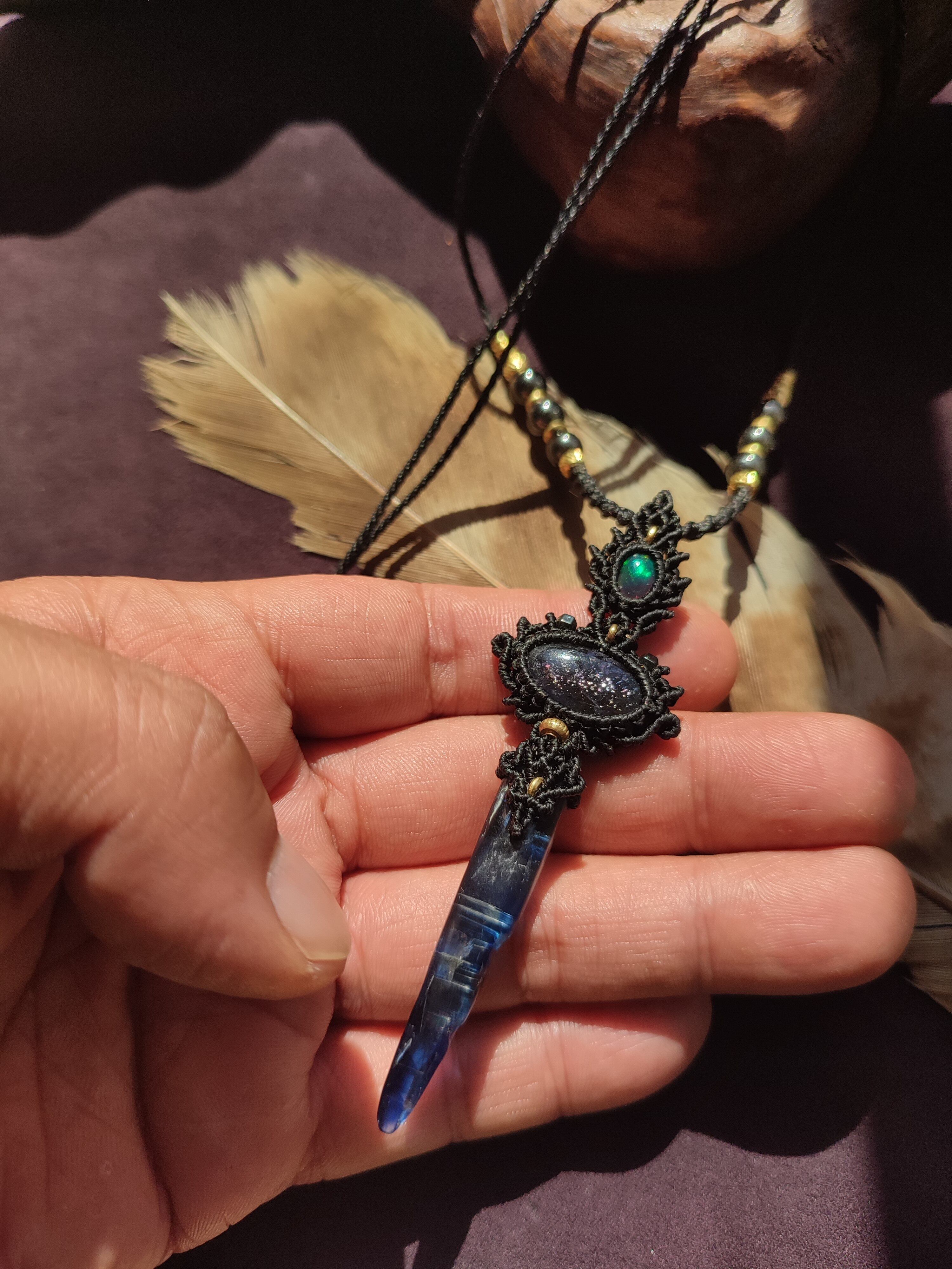 ブラックオパールとアイオライトサンストーン、カイヤナイトを使ったネックレス