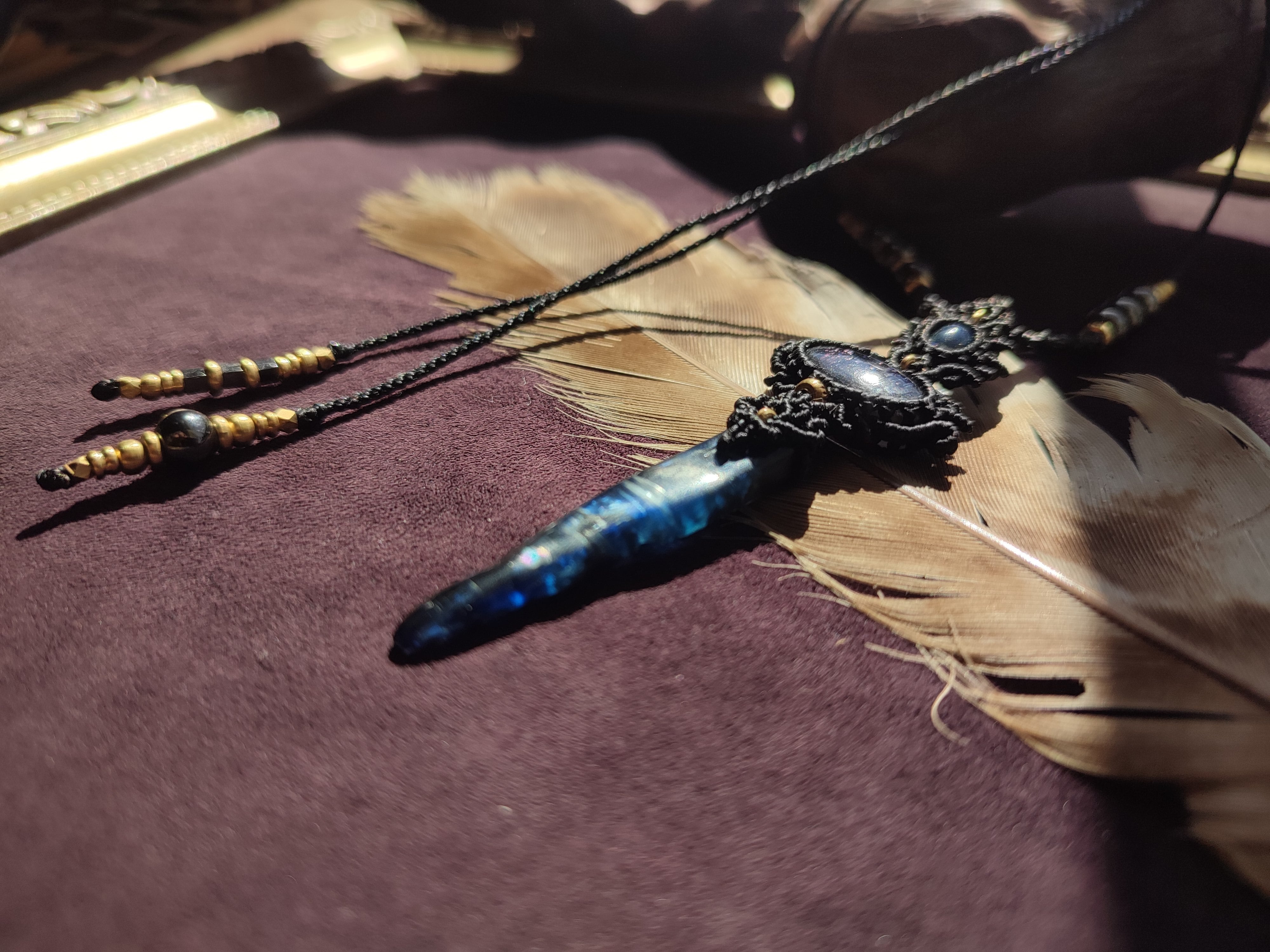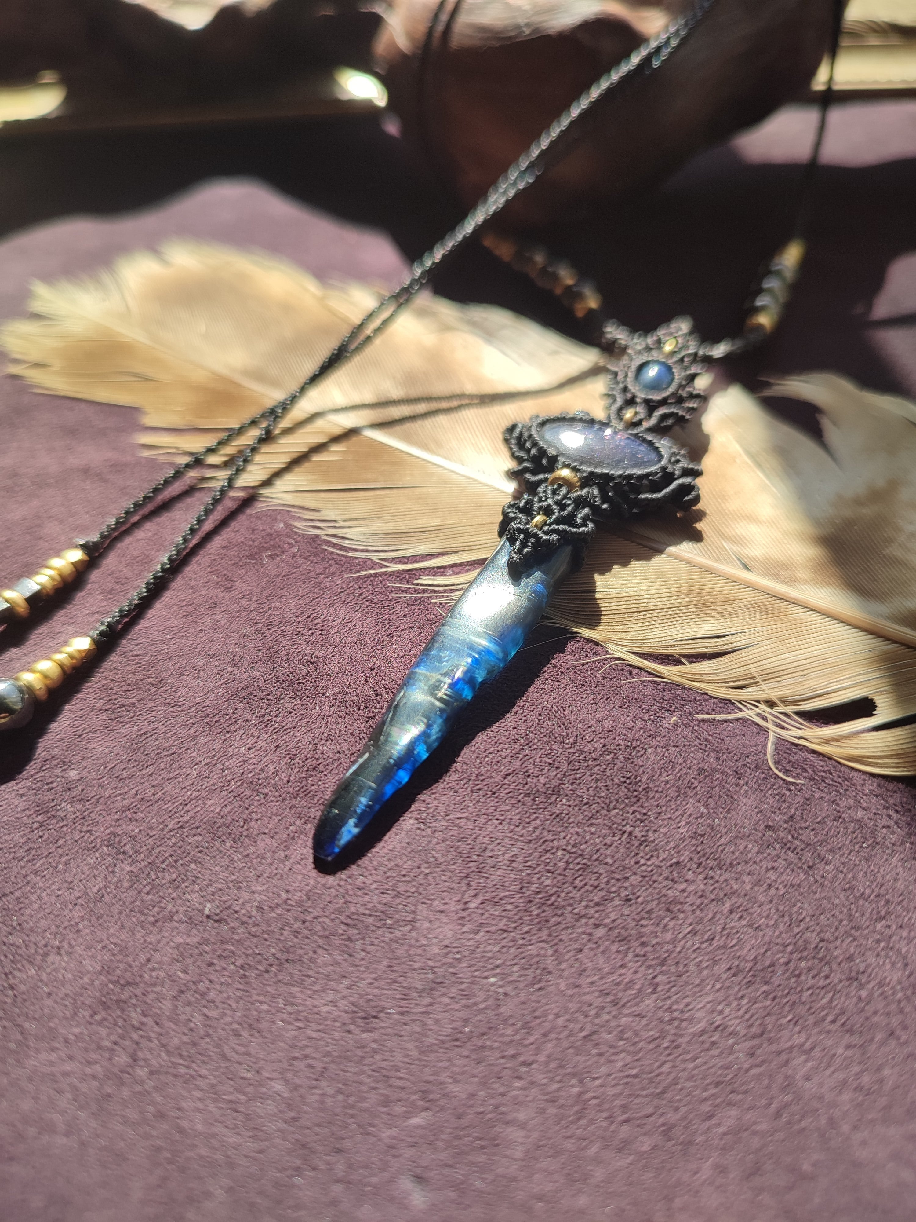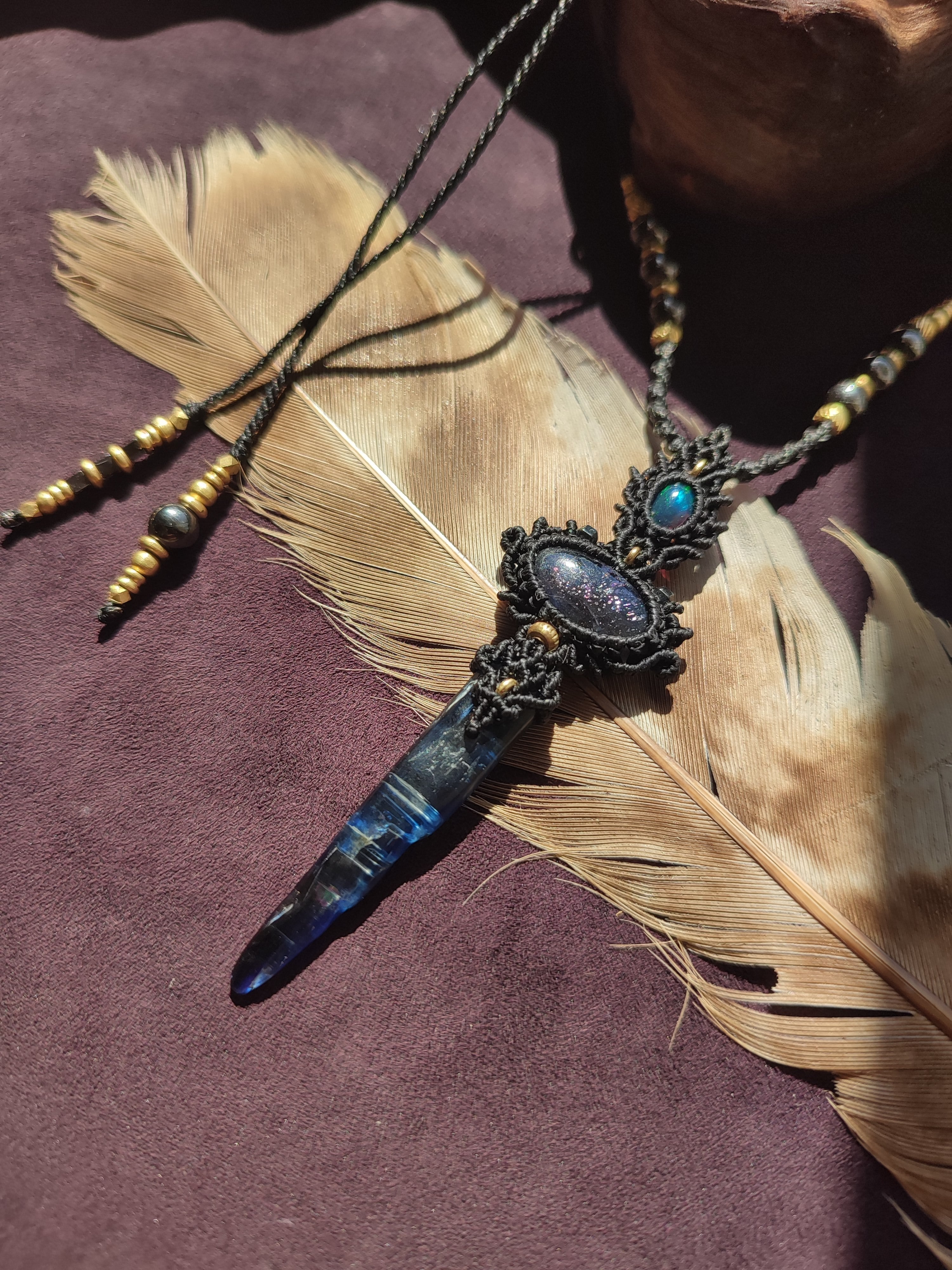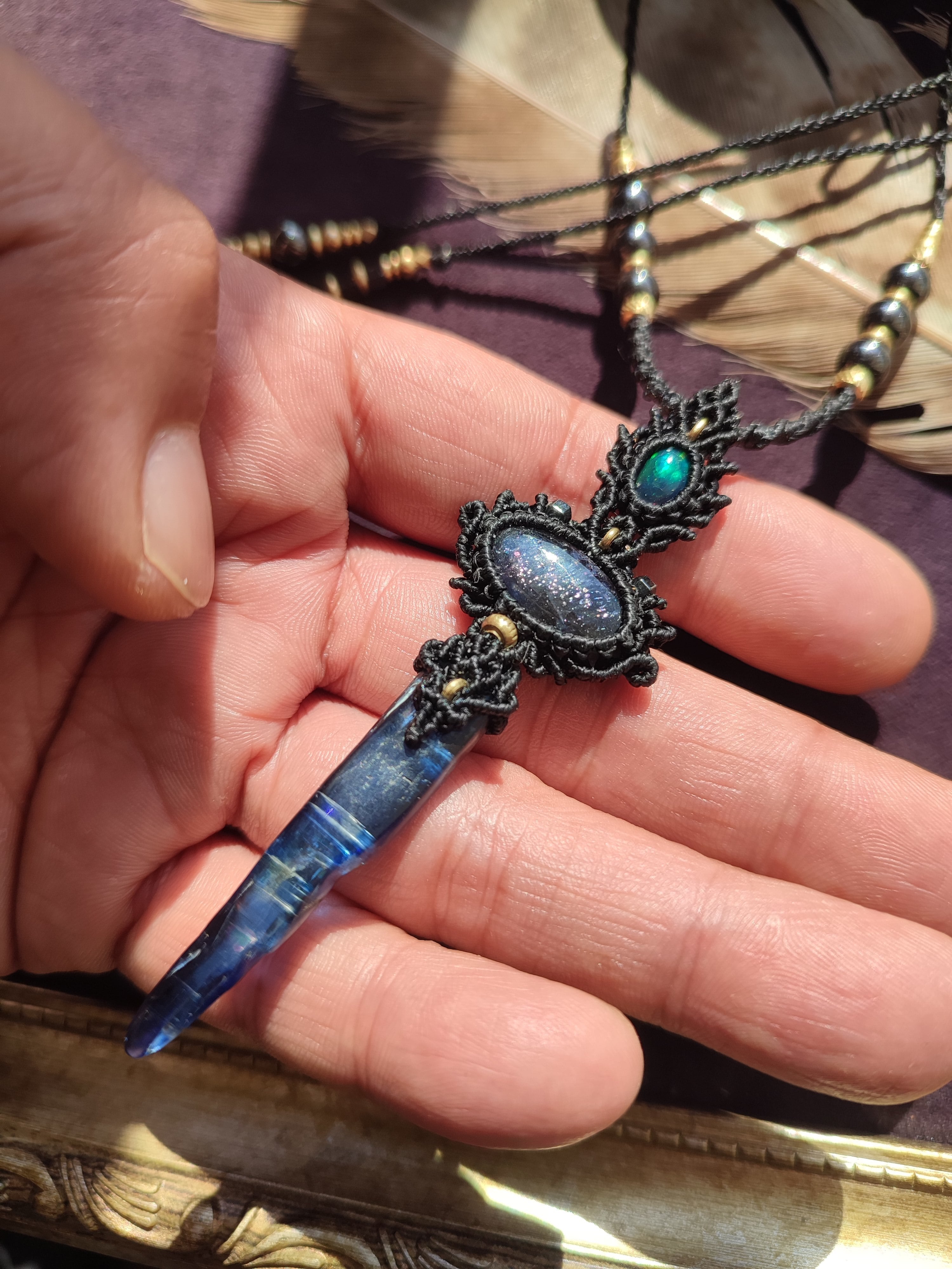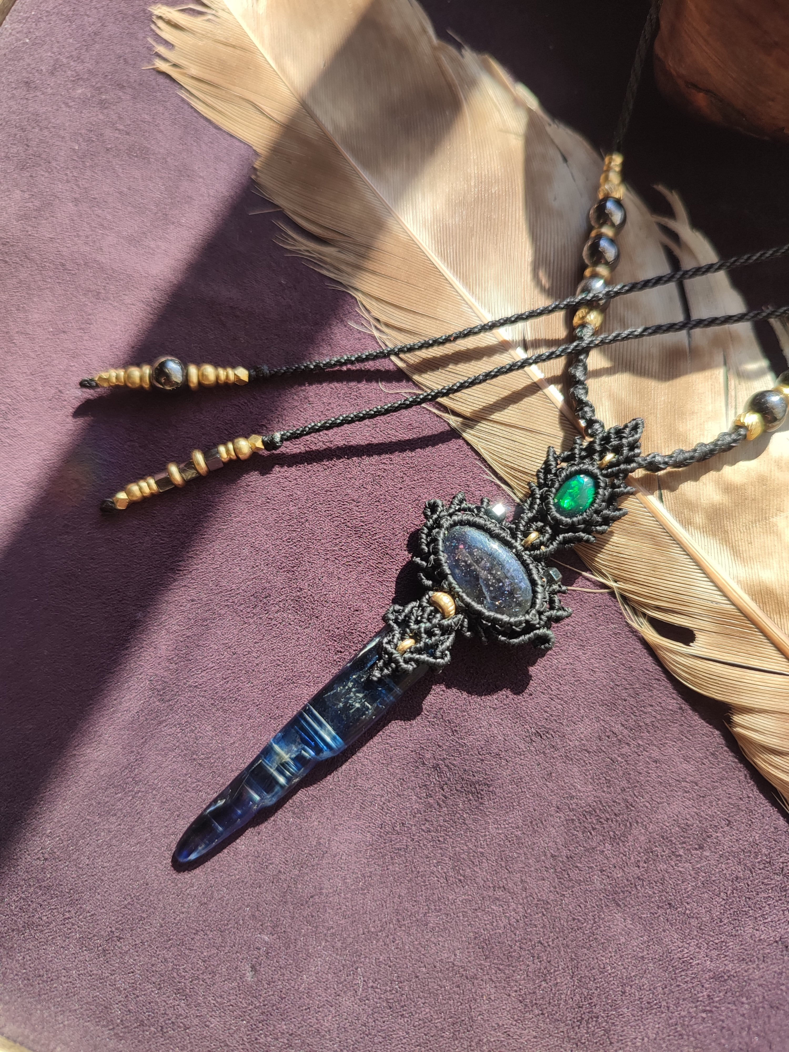 ブラックオパールとアイオライトサンストーン、カイヤナイトを使ったネックレス